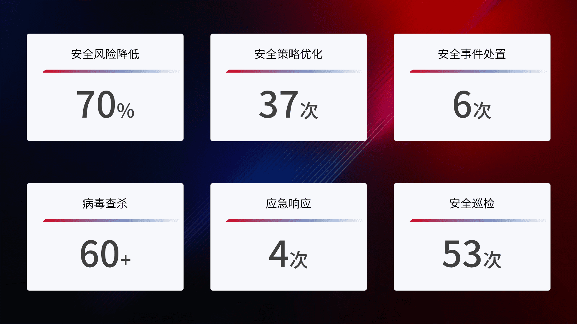 提供全面的安全事件报告体系,,,包括处置报告、、周报、、、季度和年度总结,,,,结合持续监控,,,,帮助客户深入了解网络安全状况。。。