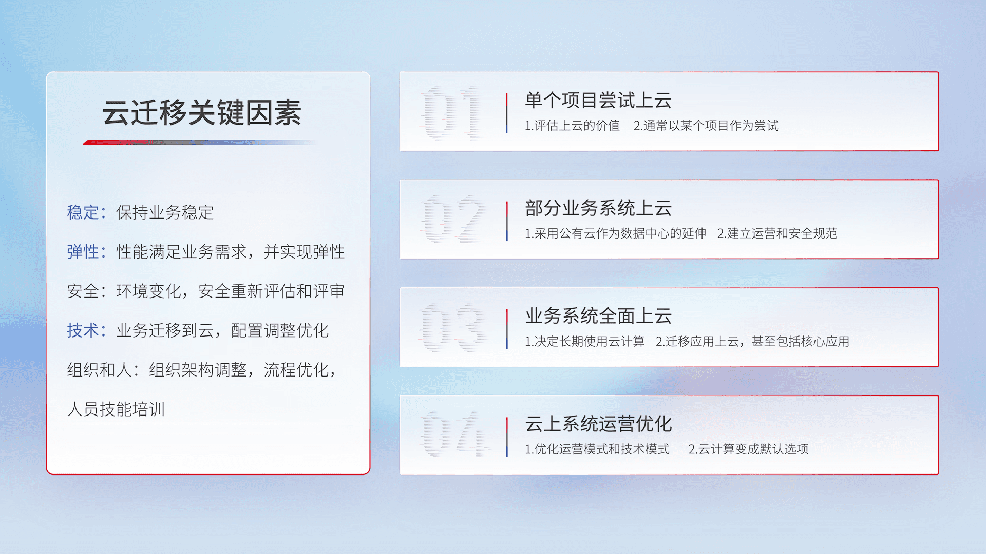 结合实际业务,,,从规划设计、、、云平台选型、、、、云原生改造、、数据迁移、、、集成交付,,,迁移全过程为客户识别最佳上云路径,,,,做好风险识别管理,,,,设计网络架构、、、、身份权限、、安全审计合规、、操作审计、、、、日志审计、、监控告警策略、、、、多站点容灾设计等,,,对云上基础设施进行整体规划,,,提升IT治理水平,,以满足弹性、、、高可用、、、、高性能的需求。。