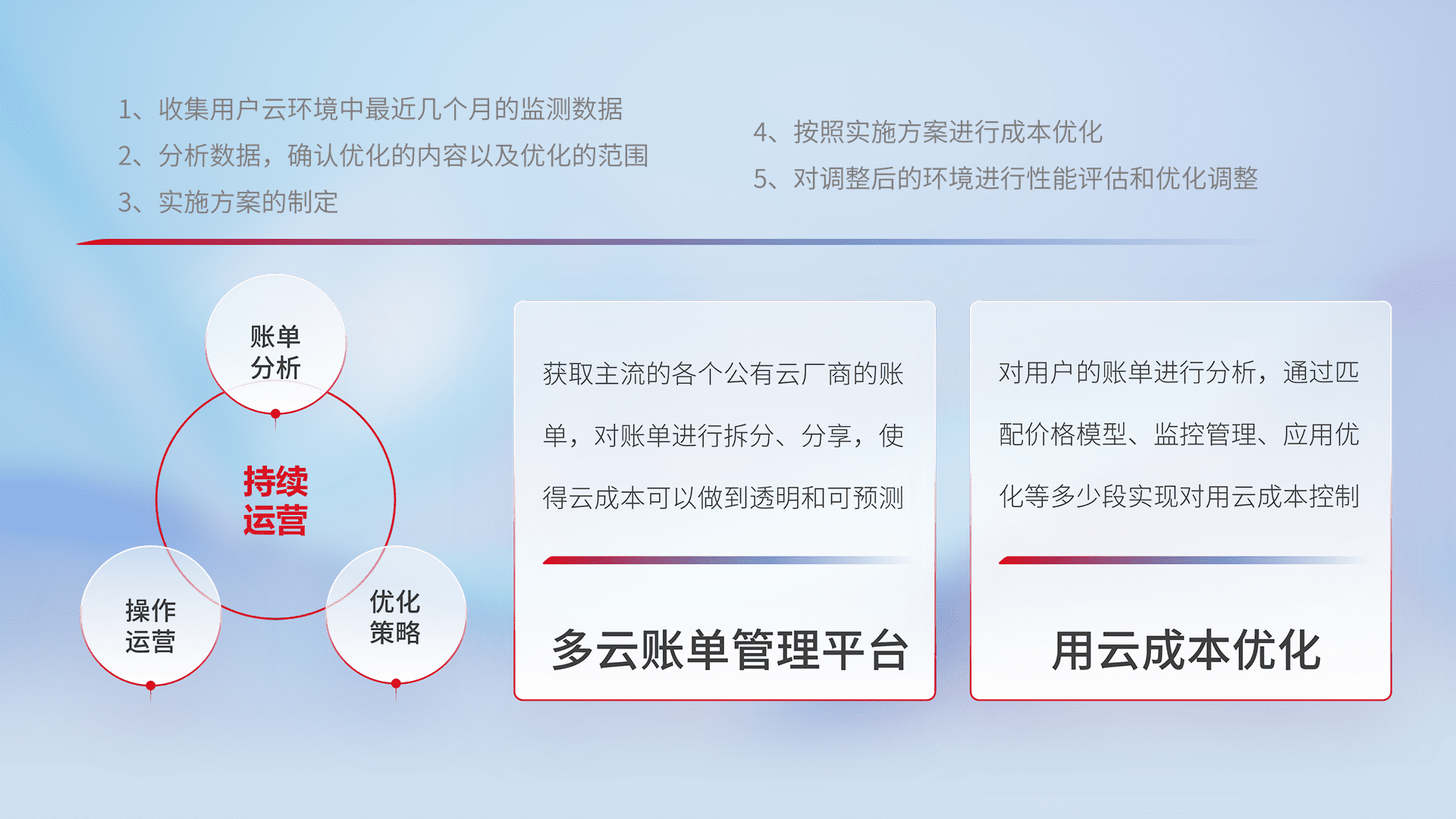 通过多云纳管,,,,以统一的资源数据模型把客户的云资源进行抽象和封装,,,,进而实现对多云资源的统一操作,,,保障云资源管理的可靠性、、、稳定性与可用性。。。量身定制化运维内容,,,配置、、开发运维、、补丁管理、、、备份、、、、监控、、认证和访问管理、、、审计和日常巡检等,,,,保障在用云过程中的可靠度,,,稳定度以及高可用率。。。